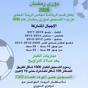 قسم الرياضة في مجلس الرينة المحلي يعلن عن انطلاق التسجيل لـ "دوري رمضان 2026"